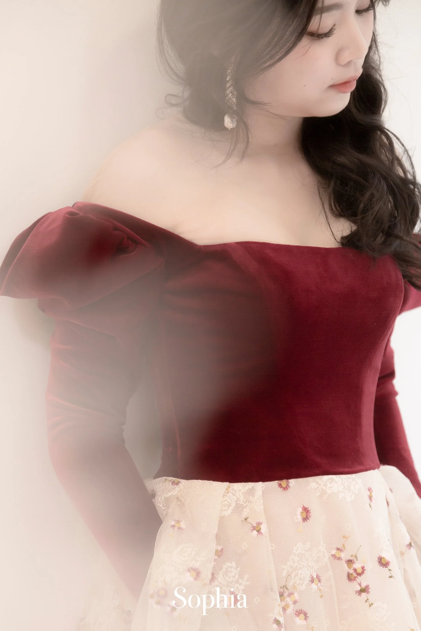 肩帶及腰間的蝴蝶結運用寬版絲絨